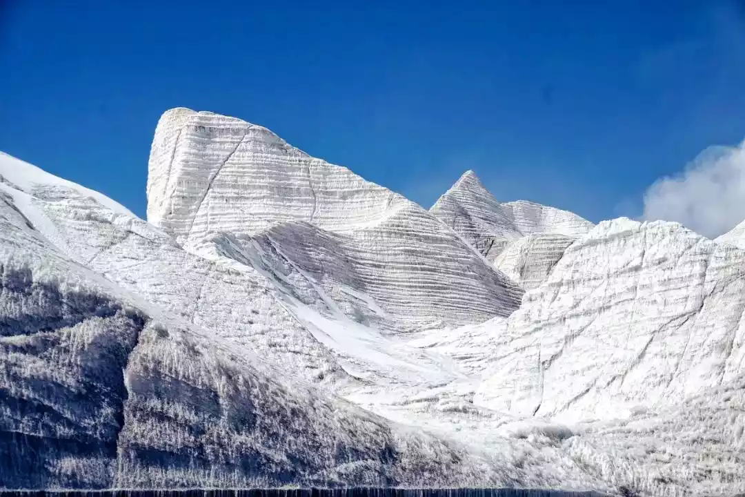 The surface of the Turong Glacier is composed of a series of parallel ridges, much like the ridges on a washboard. The vertical compression from the glacier forms ice wrinkles and cracks, presenting an uneven shape. The bottom of the glacier is a frozen moraine lake.