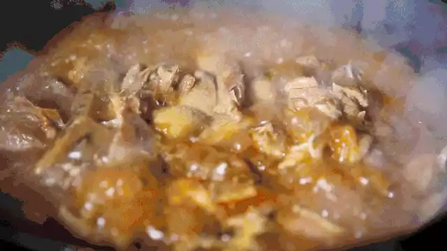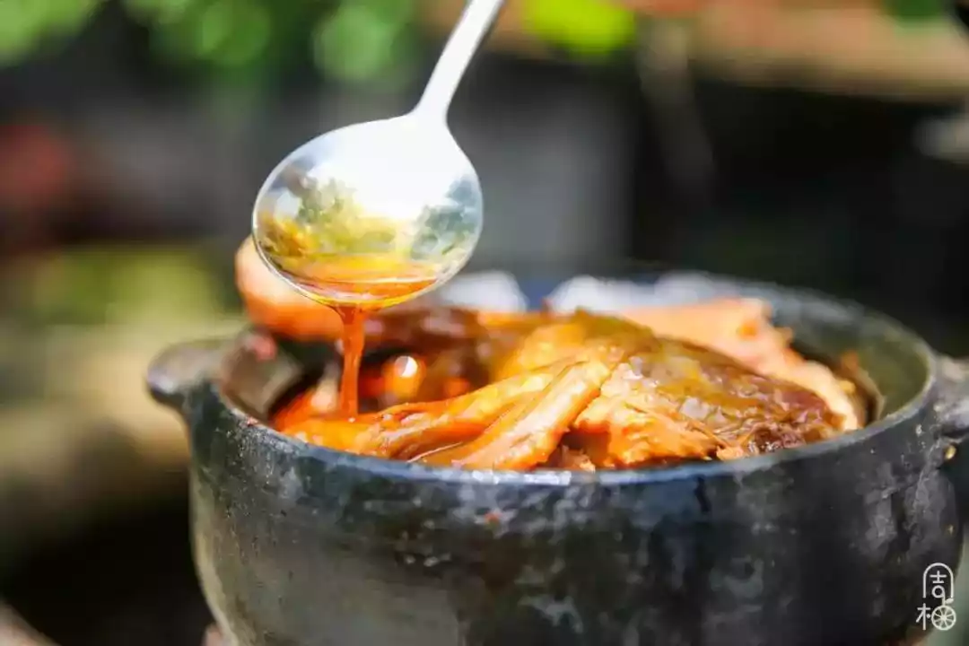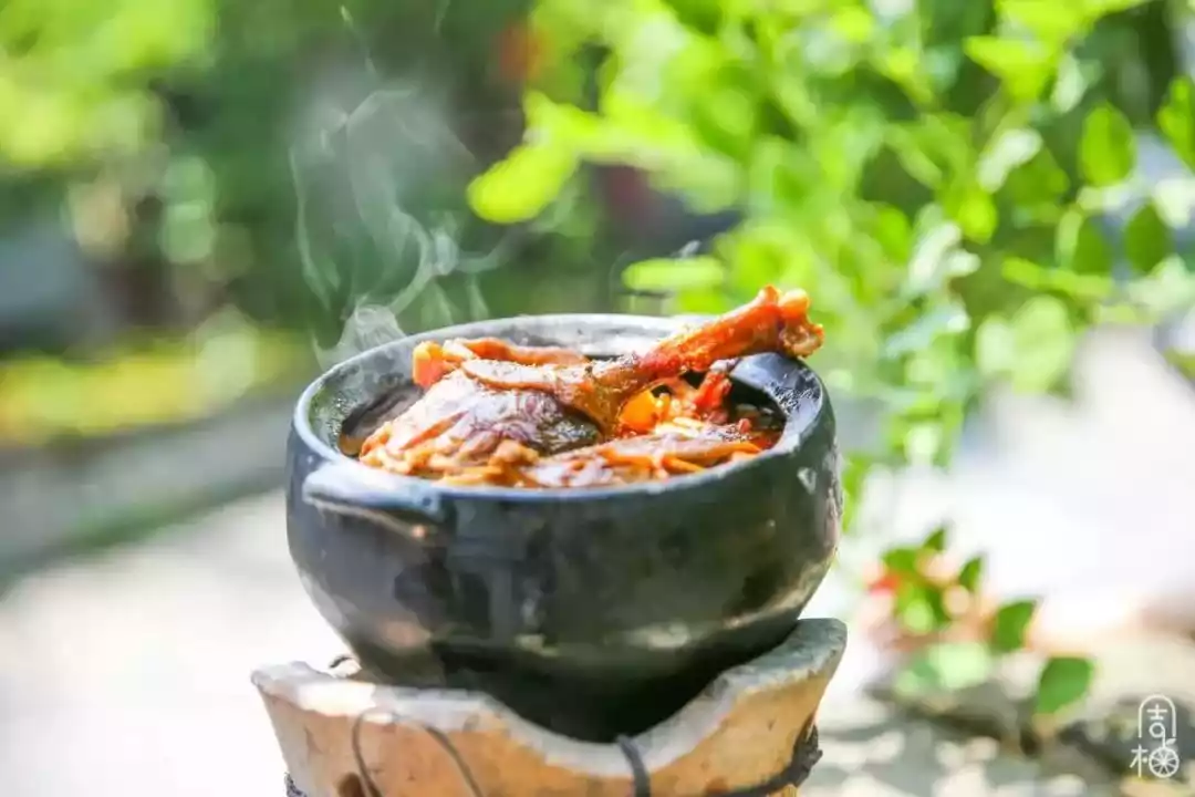 White goose stewed in an earthenware pot is a traditional dish of Jiangshan, and the Hemu charcoal pot white goose is an improvement on it. The owner of the homestay added Chinese angelica, Codonopsis pilosula, wolfberry and other medicinal materials to the original recipe. The goose meat is first stir-fried with onions, ginger and other ingredients over high heat, and then put into the charcoal pot and continue to stew.