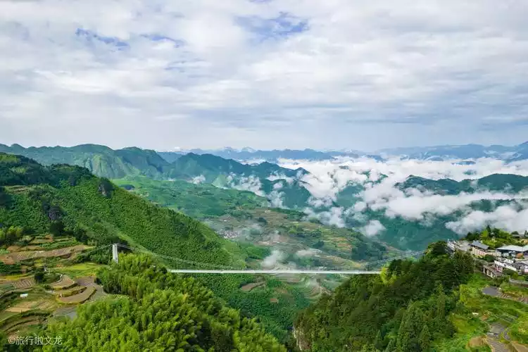 The Cloud-High Glass Bridge is built between two peaks. Standing on it, you can take in the beautiful scenery all around you. From the mountains to the villages covered in loess and green tiles, to the terraced rice fields, and even the distant sea of clouds, everything is clearly visible.