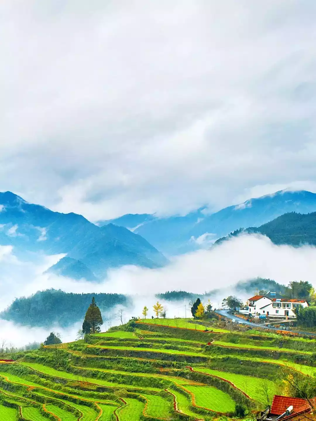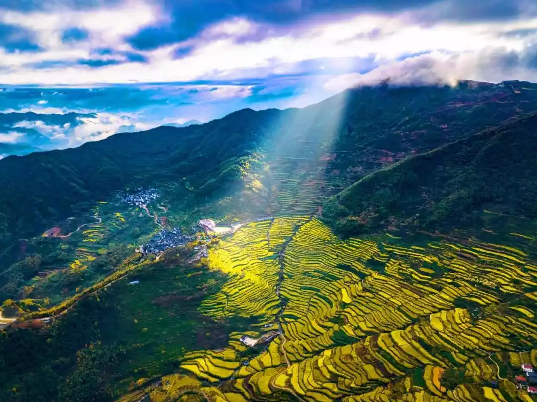 Under the blue sky, thousands of acres of terraced fields cascade down the mountainside and rise from the foot of the mountain. Their grandeur rivals the Yuanyang Rice Terraces in Yunnan. "Quiet and clear" is the best description of this place.