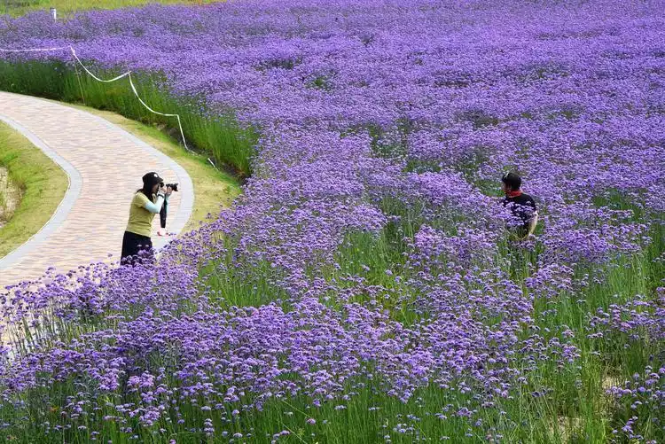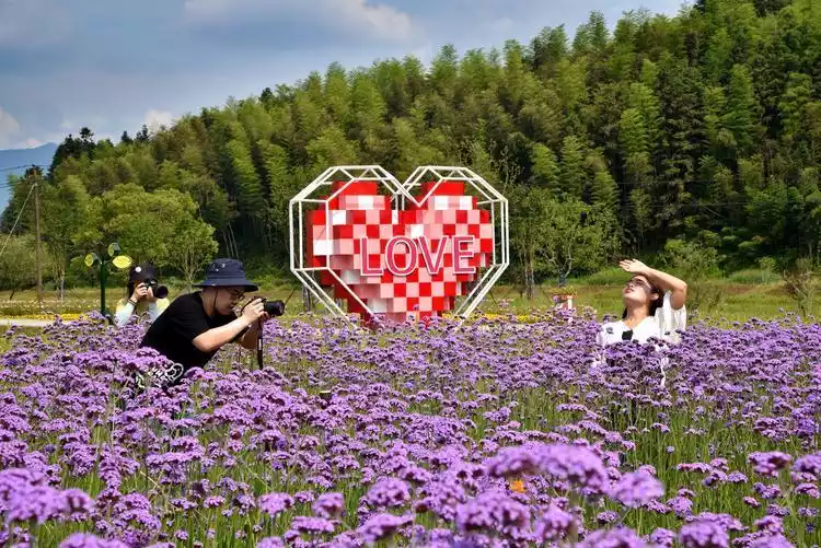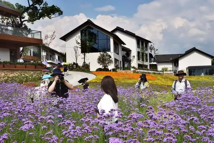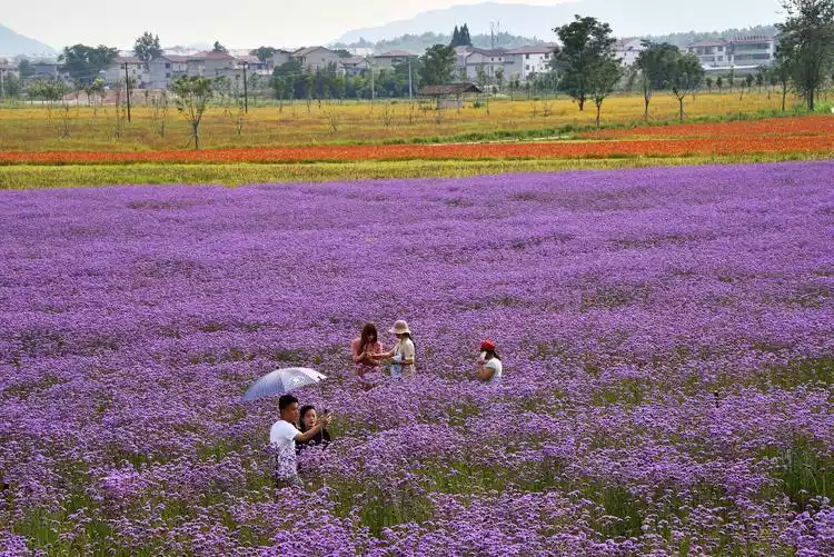 Gaoling Flower Sea consists of five areas: colorful flower art, pastel flower fields, colored glaze flower valley, Qinghualing, and exquisite garden. Dozens of different flowers are planted here, among which purple verbena grows in large areas, making it a favorite photo-taking spot for tourists.