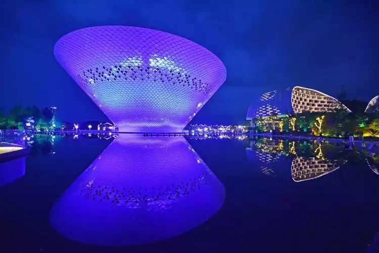 The exterior wall of the "Big Bowl" is made of nano-sprayed aluminum panels, arranged in a scaly and shingled manner. Through the projection of light, the outside of the "Big Bowl" presents a total of eight colors, and can also project changing patterns through 4D technology.