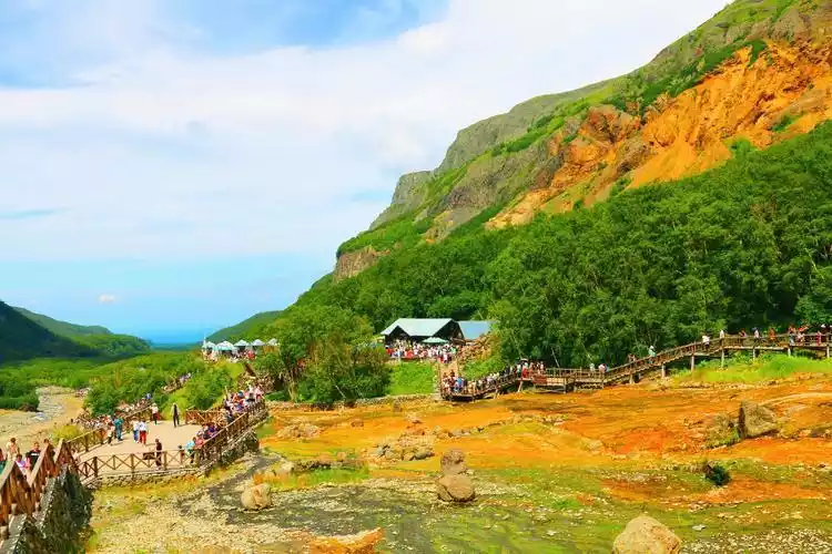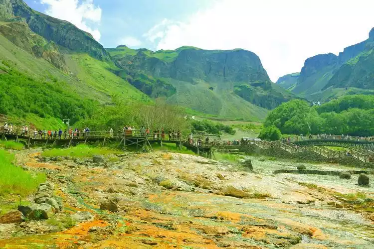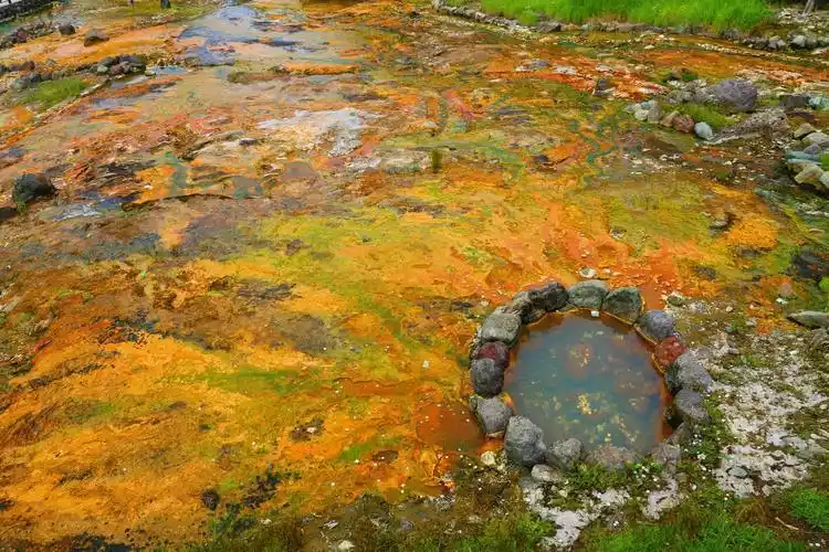 The springs are surrounded by volcanic rocks, forming small pools of varying sizes. Walking on the plank road, you can see hot spring water flowing below, and the heat rising from below is very warm.
