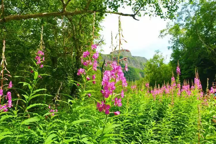 Clusters of beautiful flowers bloom on the roadside, in the mountains, and in the shade of the trees, full of vitality.