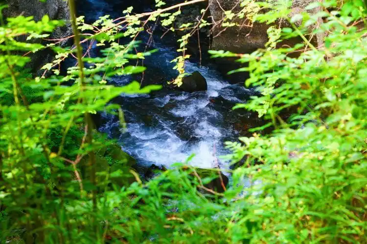 There is a trickle of river in the forest, flowing through the cracks in the rocks in the valley, sometimes fast and sometimes slow, making a gurgling sound.