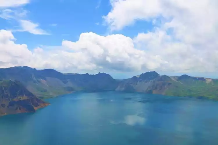 In summer, Changbai Mountain is surrounded by green trees and blue sky and white clouds, making it more vibrant.