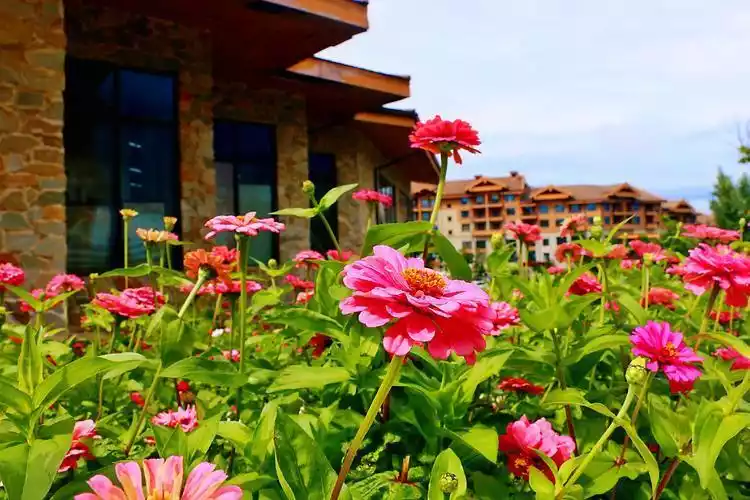 Colorful flowers and plants, lush green trees, and buildings of different styles add a touch of color to the summer.