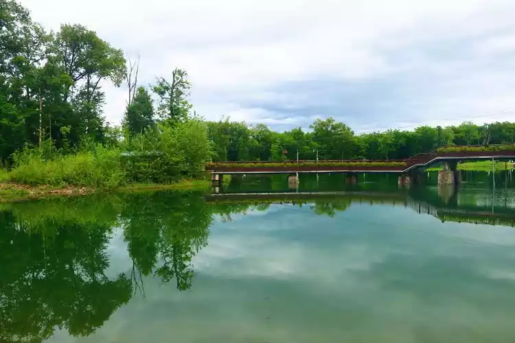 The entire covered bridge shuttles through the woods in the park. Walking on it feels like stepping on big trees, and you can touch the treetops with a casual stretch of your hand.