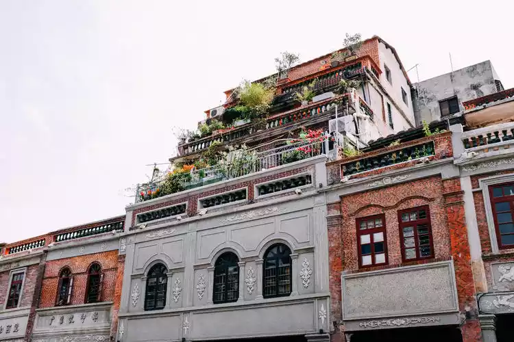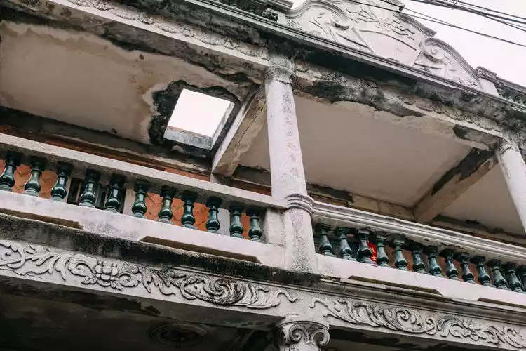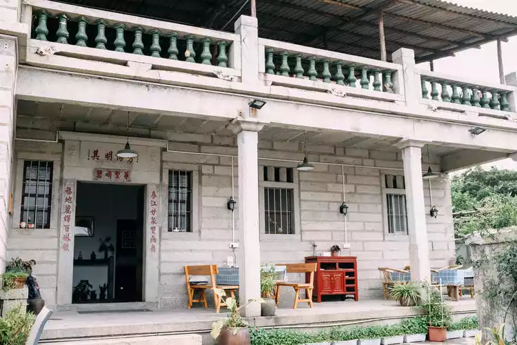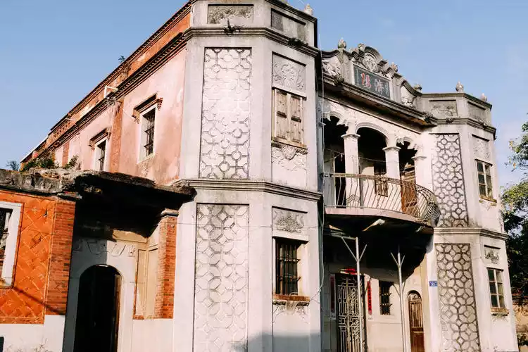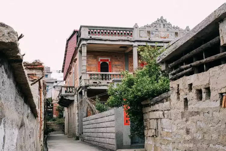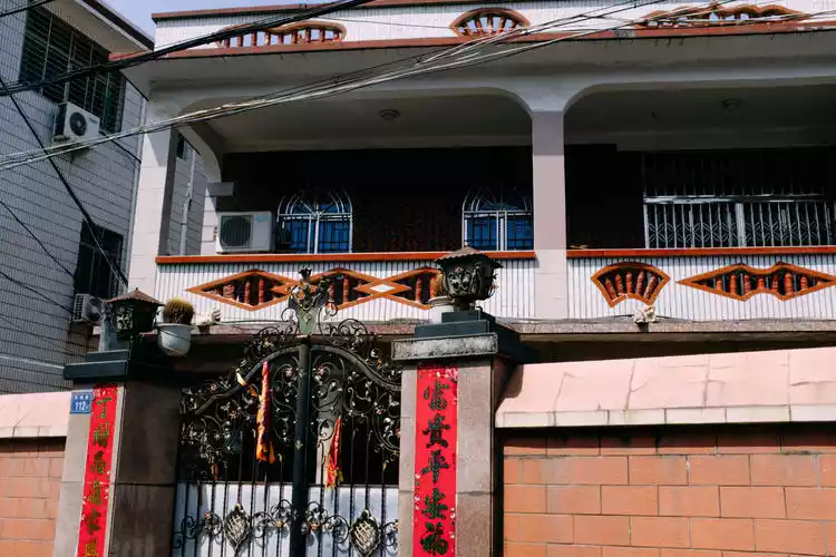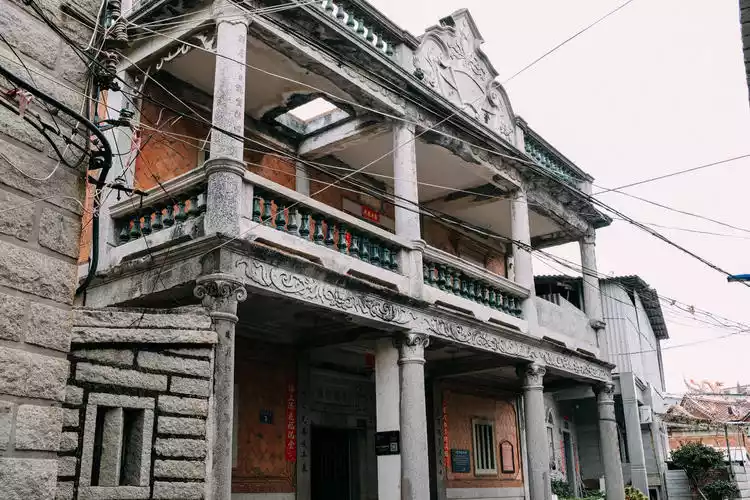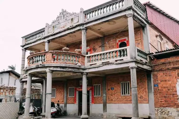 Yongning is home to a rich collection of Fanzilou (Chinese-style buildings) in Quanzhou. Each building holds a story of its owner's journey to Southeast Asia, the War of Resistance Against Japanese Aggression, the Kuomintang-Communist confrontation, and memories of that unique era. Built in 1947 by overseas Chinese Dong Qunjing, Qunjing Building is a classic example of a Fanzilou design. While retaining a distinct Nanyang style, it features a traditional red brick facade, skillfully blending Chinese and Western influences. Ten circular columns support this two-story building, and a few pots of flowers and plants adorn its balcony, adding a touch of charm. The adjacent building is still inhabited, and the owner graciously allowed us into the courtyard for a tour.