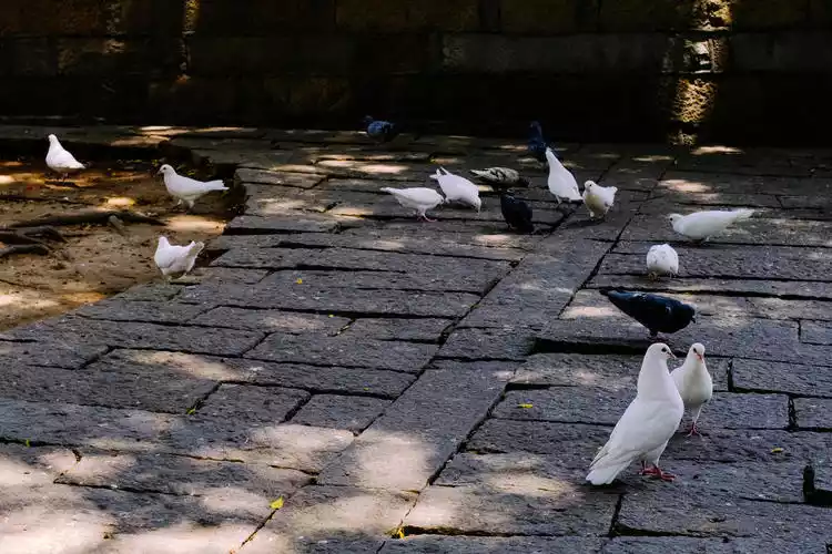 Kaiyuan Temple's central axis features the Main Hall, flanked by giant, ancient banyan trees. The long, spacious courtyard is lined with lush, robust banyan trees. Standing beneath a banyan tree, I gently feel the warm sunlight cast by the trees, illuminating my shadow. Fat pigeons stroll beneath the trees, drinking water. The birds, bathed in divine light, are truly different, not at all afraid of people.