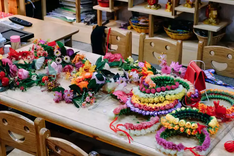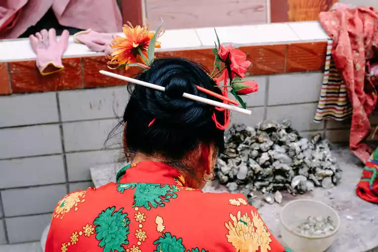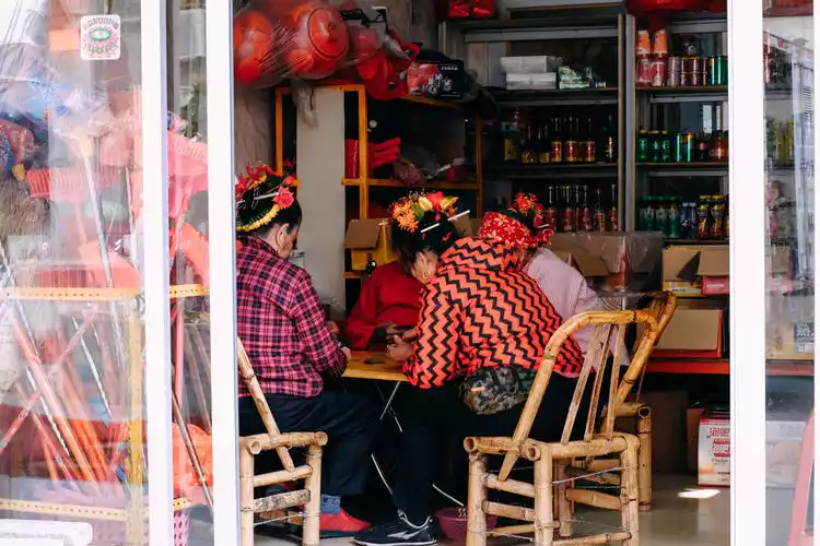 The women on the main street are all working. Even when they are laboring, they dress themselves up beautifully. Their black or gray hair is piled up high and decorated with bright flowers. The more flowers they put on, the more beautiful they are. The details reveal their serious attitude towards life.