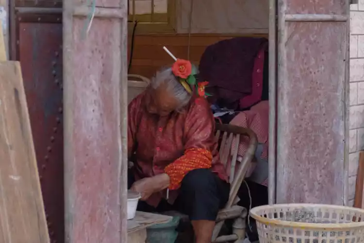 It's so sad to see this old lady. She may have been doing repetitive labor all her life. Her neck is so crooked that she can't even lift it up. Yet she is still working so hard at such an old age.