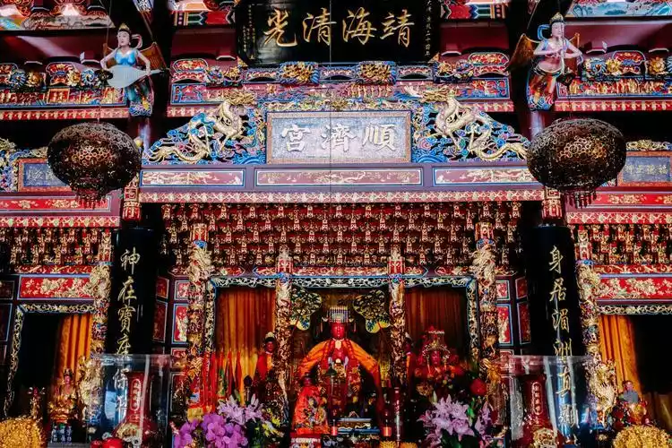 The temple is resplendent with golden emeralds and vibrant colors, a testament to the meticulous care and investment of the local residents. The main hall, dedicated to Mazu, the goddess of the sea, is five bays wide and four bays deep, constructed in a gabled roof style. Dedicated to Mazu are the Great Mazu, Second Mazu, and Third Mazu, along with Guanyin. Legend has it that Shi Lang, while on the platform, once visited the temple to seek divine guidance. Behind the platform, a plaque reads, "Jinghai Qingguang." The left inscription reads, "The 24th Year of the Kangxi Reign of the Qing Dynasty." The right inscription reads, "Erected by Shi Lang, the Admiral, General Jinghai, Marquis of Jinghai. Renovated in the Gengwu Year." The current wooden plaque was erected in recent years.
