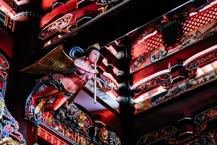 There are flying fairies on the beams on all four sides, each with a different posture.