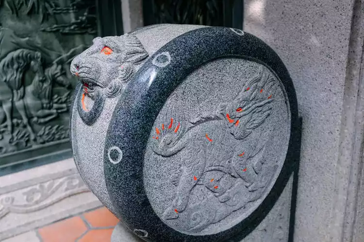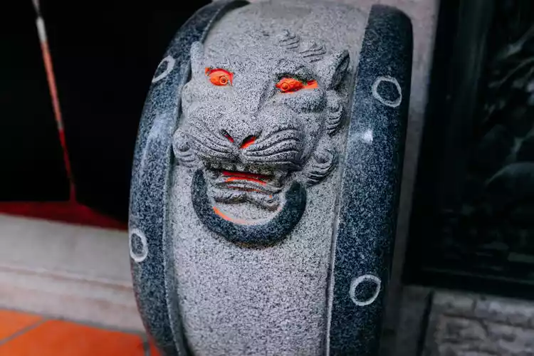 The eyes, mouth, nose and claws of the stone statue at the door were all painted with colors.