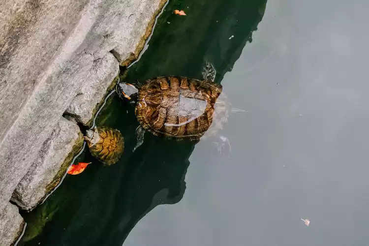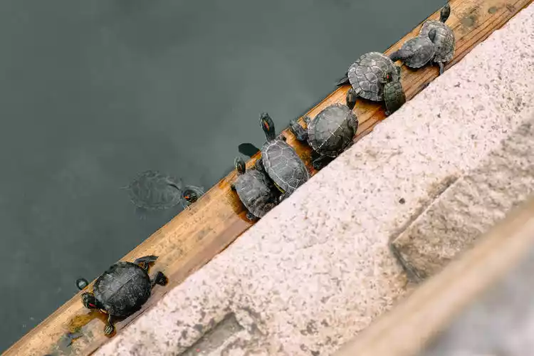 There are many turtles in the pond, and the smaller ones are lying on the wooden boards.
