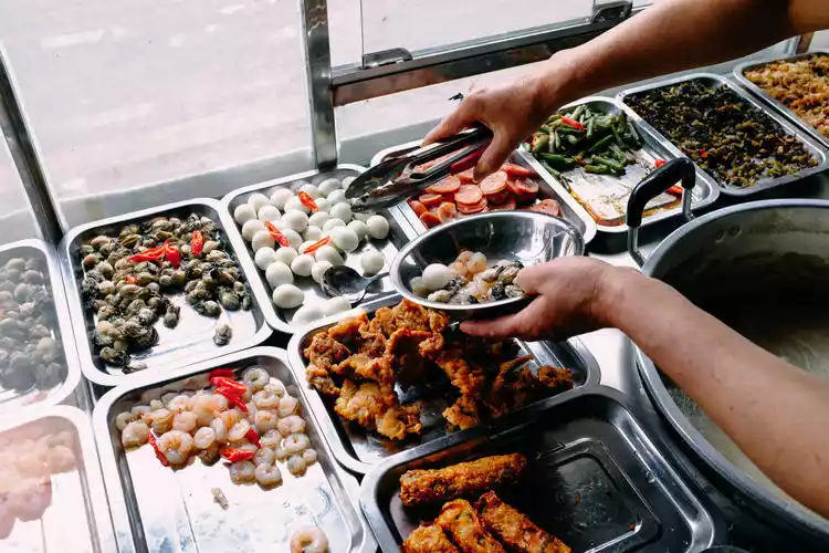 Toppings include seafood, vinegar pork, duck intestines, pig blood, and large intestines. The vinegar pork is a must; it's a local specialty, and its texture resembles boiled crispy pork. Oysters and squid are optional; they might have a slightly fishy flavor, but they're incredibly fresh. Don't forget to order the fried dough sticks (youtiao), which are perfect for dipping in the rice noodle soup. It's a truly satisfying breakfast!