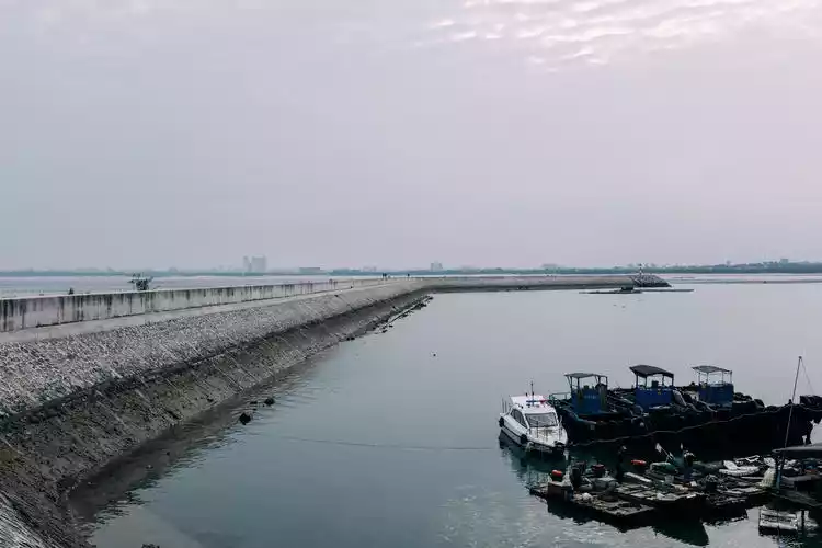 The levee is surrounded by seawater and cruise ships on both sides, with only a path in the middle stretching out into the distance, giving the impression of being on a journey to the mountains and the sea. The weather is clear, with flocks of birds flying overhead, fishing boats moored or sailing, residents fishing on the levee, and myself chasing the sunset.