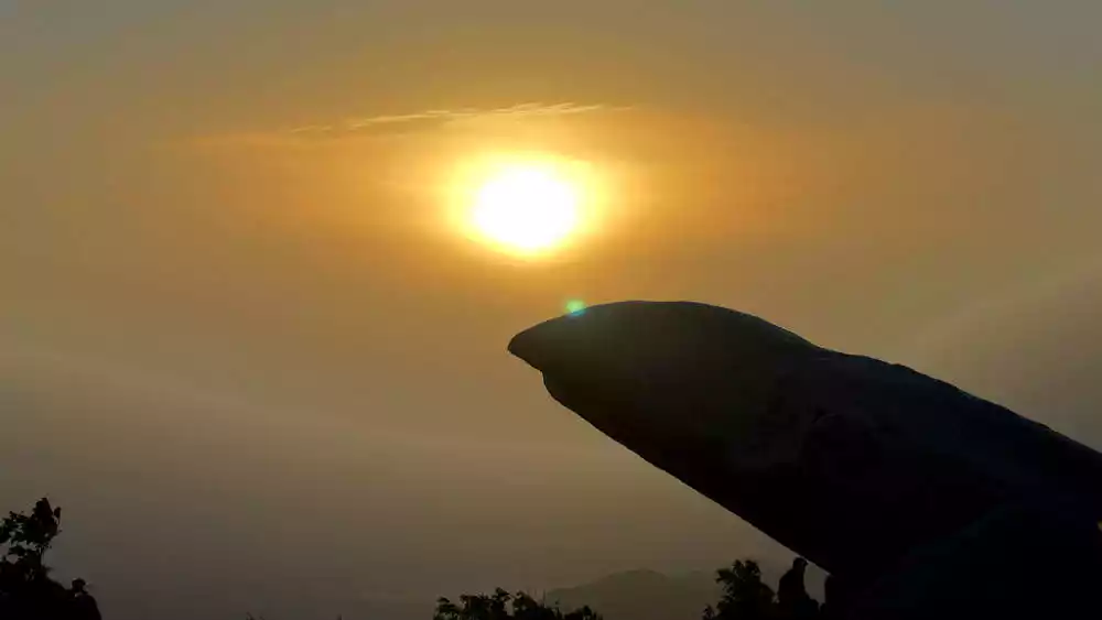 If you are lucky, in the foggy early morning or evening, if you look in the direction of the light from a higher mountain, you may see a colorful halo with blue inside and red outside on the misty curtain, reflecting the entire human figure or head shadow, like the colorful halo above the head of a Buddha statue. This is called "Buddha's light" or "precious light".