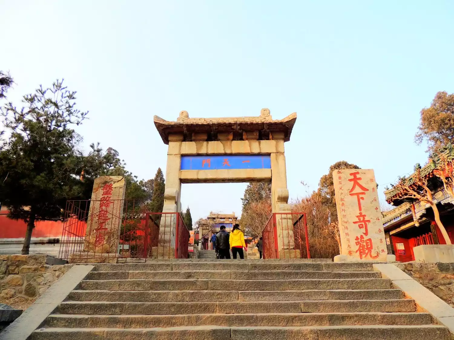 The end of Mount Tai's Eighteen Bends, formerly known as the Three Heavens Gate or Heavenly Gate Pass, stands at an altitude of 1,460 meters. This is the most precipitous point on the mountain, with the summit just beyond. Built in the low valley between Feilong Rock and Xiangfeng Ridge, the two peaks form a serene scene, resembling a gate opened from heaven. Founded in 1264 by Taoist priest Zhang Zhichun, the gate is a loft-style structure with a stone archway and the inscription "South Heavenly Gate."