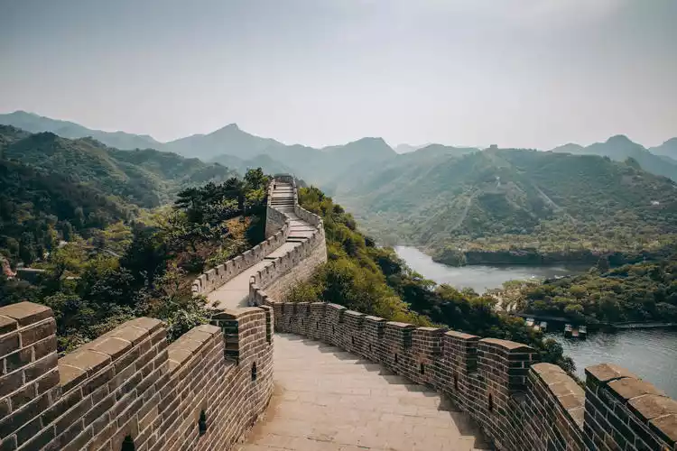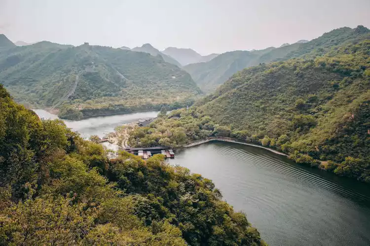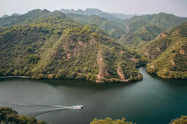 The spectacular sight of the Great Wall plunging into the water is quite captivating. A magnetic cable car ride takes you to the beacon tower at the top of the mountain, offering a panoramic view of the surrounding mountains. Surrounded by lush green hills, the water is of exceptional quality. From the summit, the Great Wall overlooks the small island in Haoming Lake, a breathtaking spectacle of lake and mountain scenery.