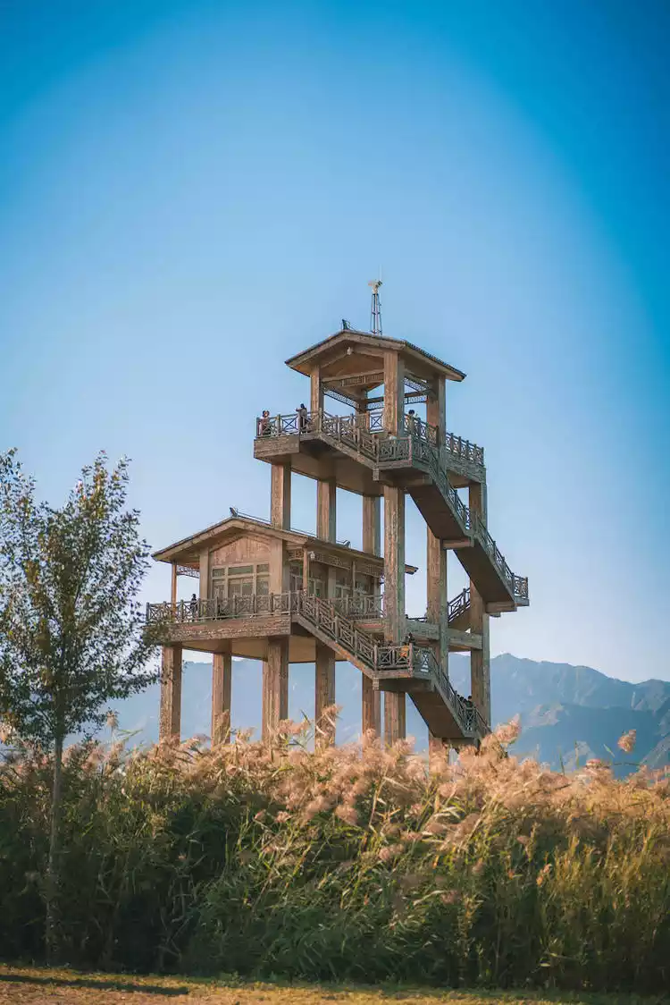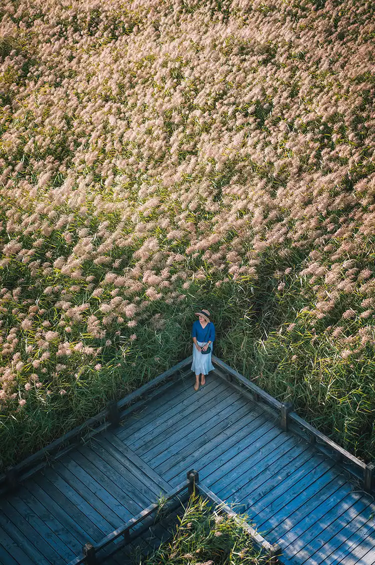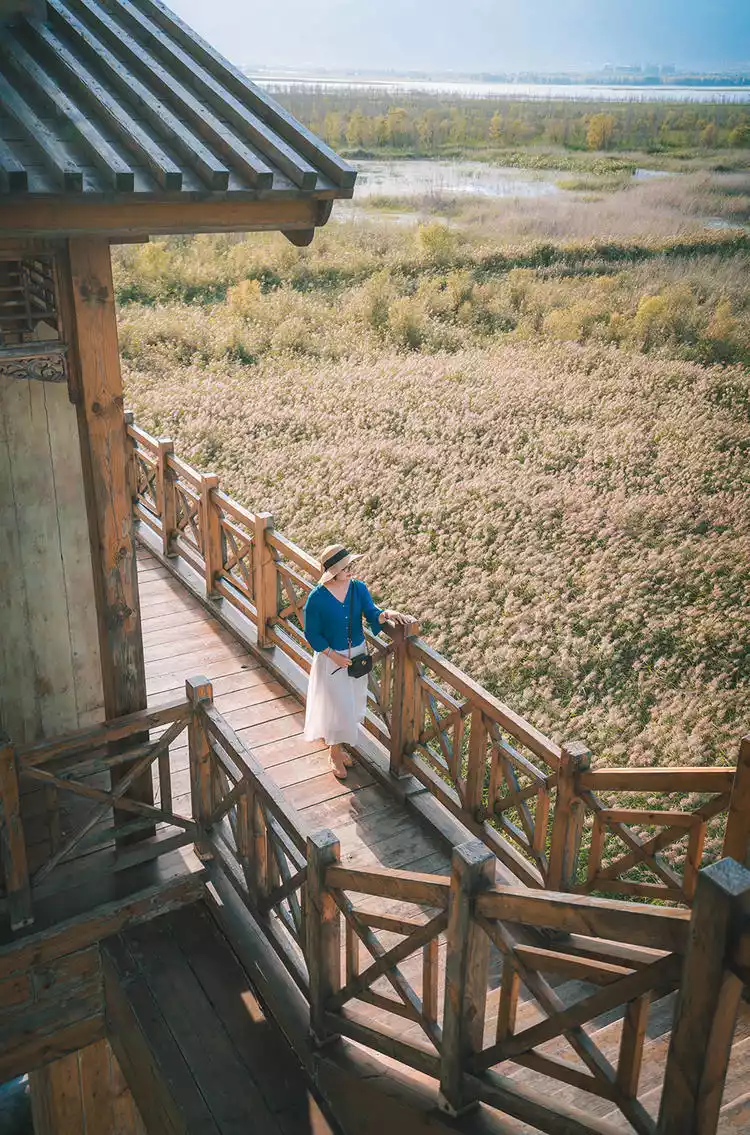2. Once you enter, turn right and continue along the wooden plank path. At the end, turn right again and you'll reach the Wanghu Tower in the wetland. From the high observation deck, take a bird's-eye view of the vast expanses of reeds—it's so beautiful! Every shot is a masterpiece! This is a must-visit!