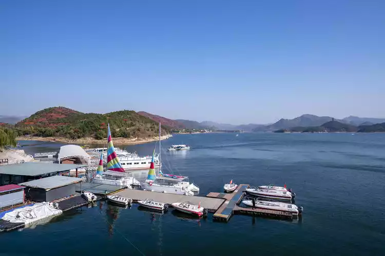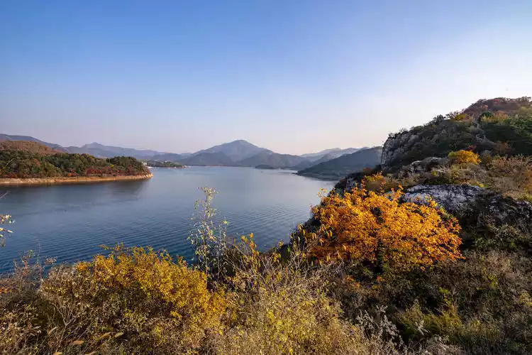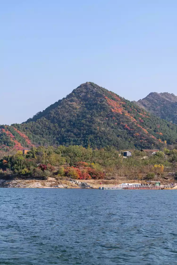 With turquoise skies and vibrant red leaves, autumn in Beijing is one of the most captivating seasons of the year. Northeast of Beijing, in Pinggu, lies a breathtaking spot for enjoying the autumn scenery. Clear waters and crimson foliage create a scene reminiscent of Switzerland – this is Jinhai Lake. Surrounded by mountains on three sides, the warm sunshine casts a deep blue expanse, while the surrounding hills, covered in vibrant red, evoke a rich autumn atmosphere.