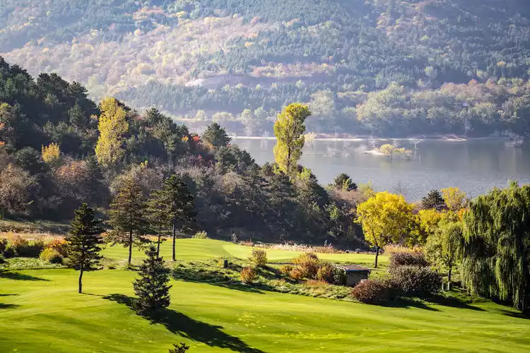 From the hilltop of Jinhai Lake's jagged cliffs, you can see fiery red leaves in the foreground and the clear waters of the lake in the distance. There are many nice hotels and golf courses along the lake, and many people come here to play golf on weekends. The scenery is also quite beautiful.