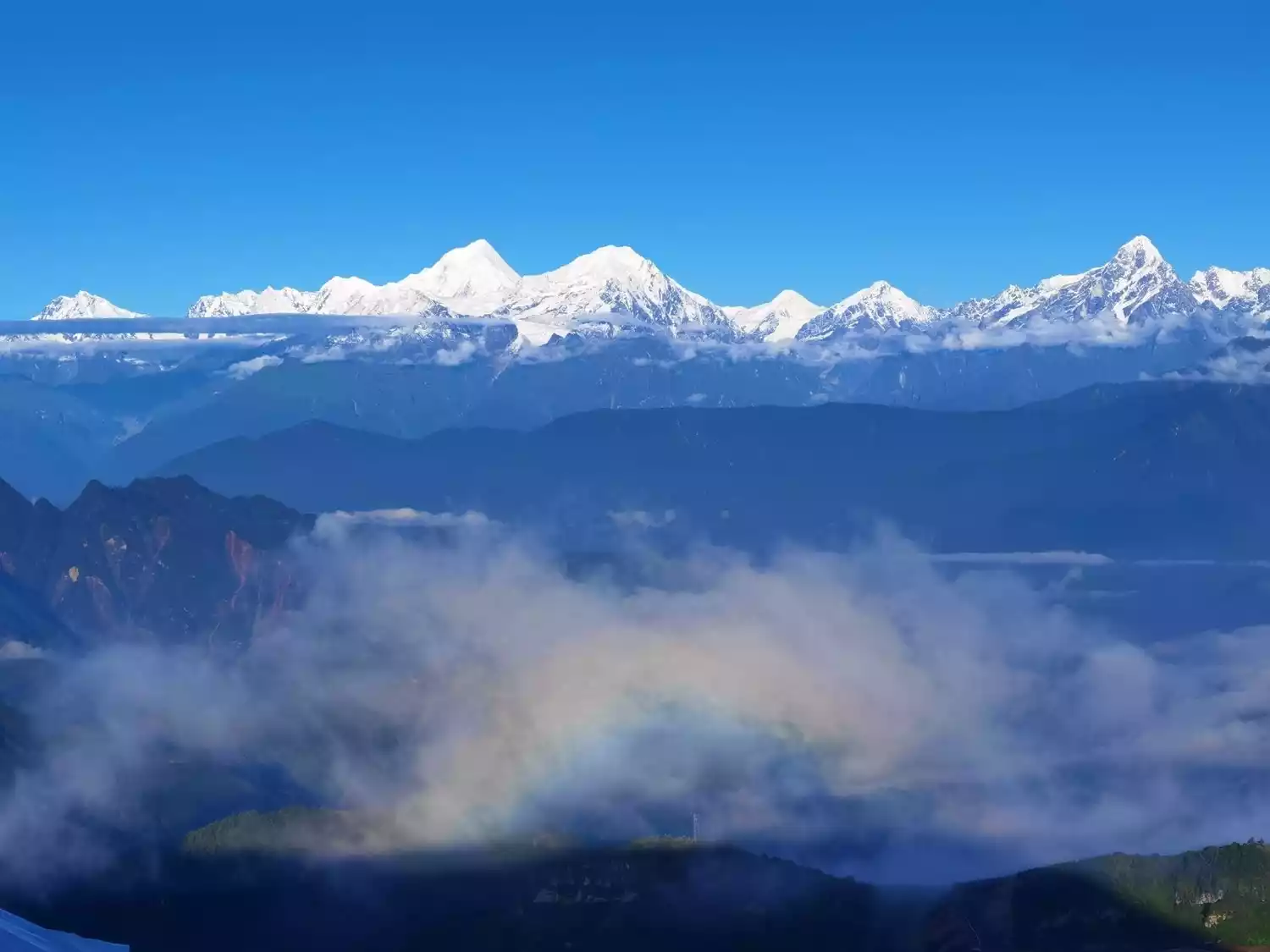 Niubei Mountain, located at the junction of Yingjing County, Ya'an City, Sichuan Province, and Luding County, Ganzi Prefecture, is a branch of the Erlang Mountain Range and forms the natural geographical boundary between the Sichuan Basin and the western Sichuan Plateau. Nestled against the western Sichuan plain, Niubei Mountain faces Gongga Snow Mountain, the King of Sichuan Mountains, across the Dadu River, a mere 50 kilometers away. It offers the best viewpoint from the eastern slopes of Gongga Snow Mountain, offering stunning views of its main peak. Promoted by China National Geographic magazine and Lü Linglong's photo albums, Niubei Mountain has been dubbed "China's largest 360-degree viewing platform." From Niubei Mountain, one can admire the sunrise and sea of clouds to the east, with distant views of Mount Emei, Wawu Mountain, and other famous Sichuan peaks. To the west, panoramic views of the central section of the Great Snow Mountain Range, with Mount Gongga as its main peak, are offered. To the south, the southern Sichuan Basin ranges, including the Daxiangling (Nibashan) and Xiaoxiangling, can be seen. To the north, Siguniang Mountain and Jiajin Mountain are faintly visible.