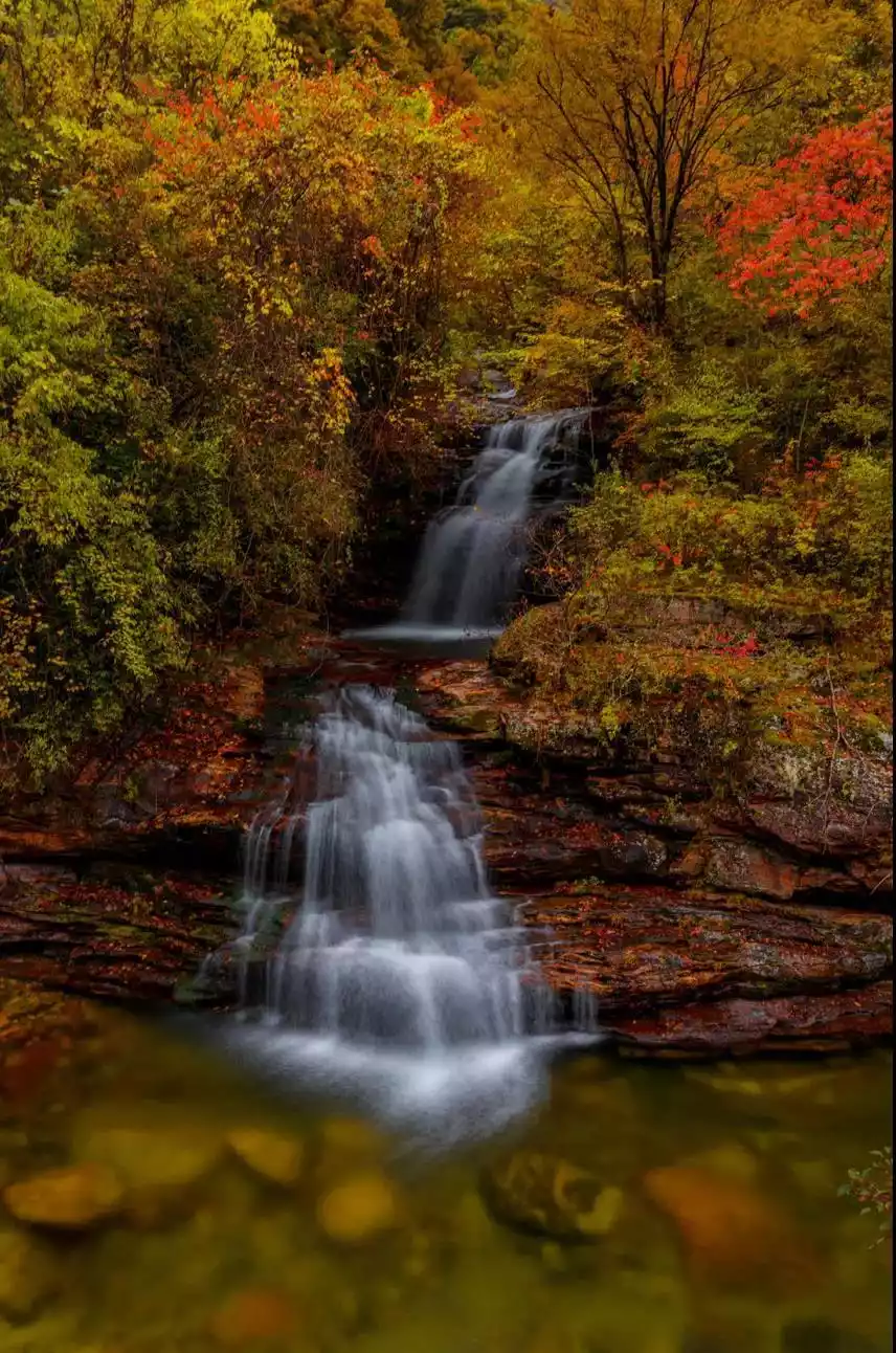 In autumn, Yaoluoping's maple leaves turn red, creating a picturesque scene, resembling an overturned bottle of dye, a riot of color. The most picturesque spot in Yaoluoping is the Ten-Li Gallery, an undeveloped deep mountain canyon lined with exotic flowers and plants, lush forests, and bamboo groves – a truly breathtaking sight!