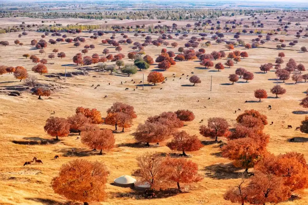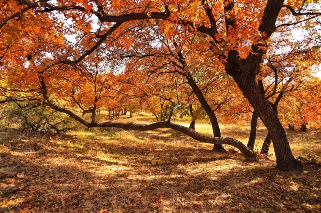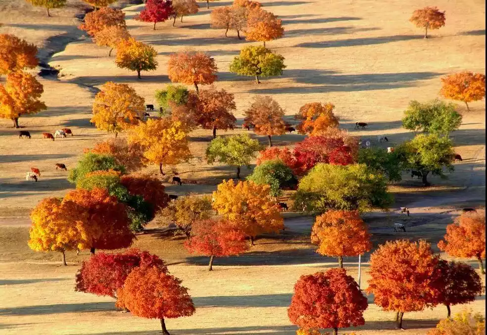 Going south along the grassland, you will enter another maple holy land, Udantala. The maples here grow on grasslands and sandy land. Many of them have independent crowns, standing tall and majestic. After the autumn frost every year, the maple leaves are colorful like brocade and extremely enchanting.