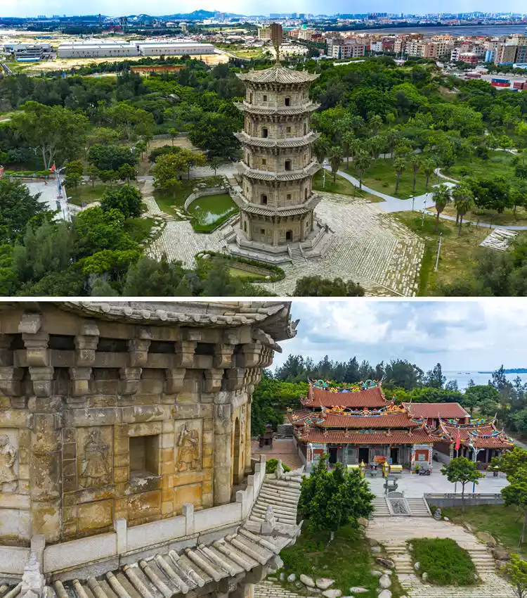 The tower is 21.65 meters high, octagonal, and five stories tall. It is a hollow granite tower imitating a pavilion style. Unadorned with carvings, it exudes a rustic simplicity and boasts an ingenious layout. It serves as an important maritime beacon for ships entering and leaving Quanzhou Harbor.