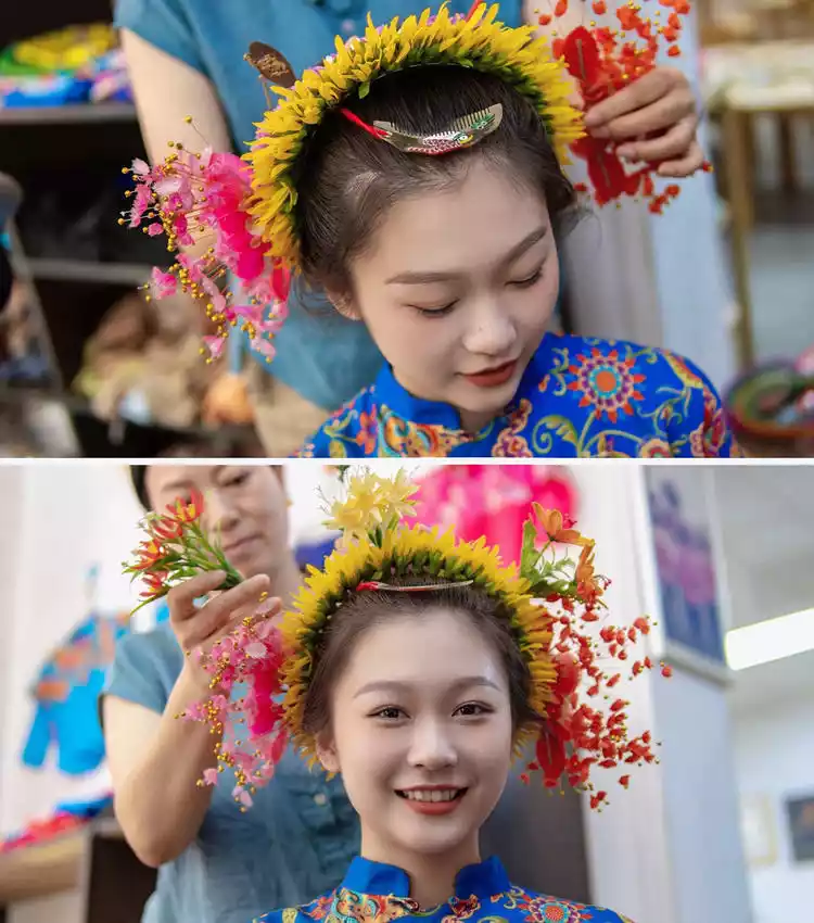 Their headdresses are unique. All women are proud of and consider it beautiful to wear flowers in their hair or wear flower rings in their hair. The romantic practice of putting flowers on their heads in front of the mirror has been passed down for thousands of years. It is said that this is an Arab custom left over from the Song and Yuan dynasties.
