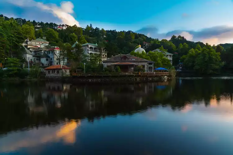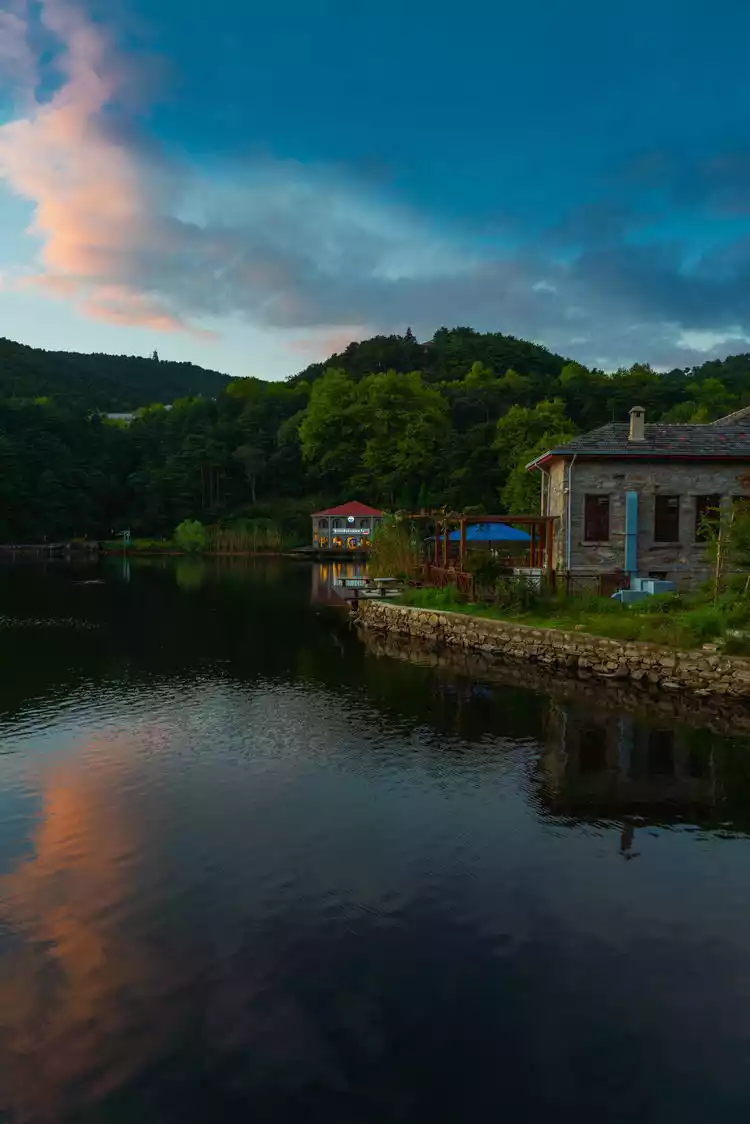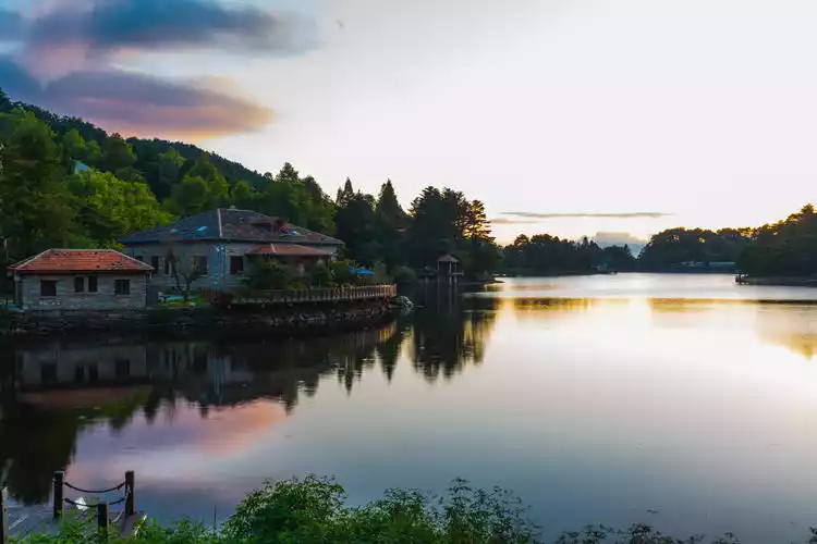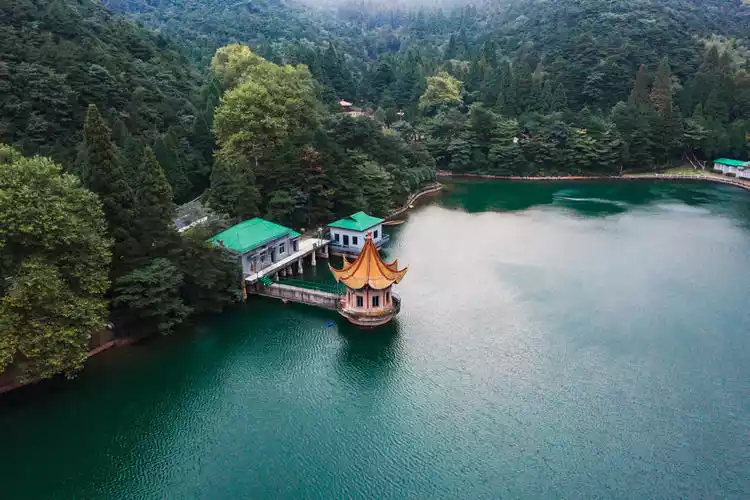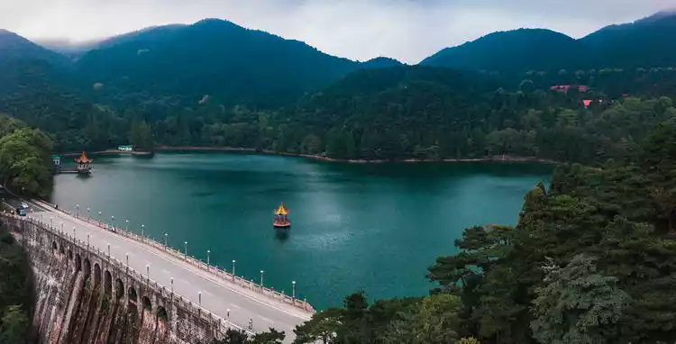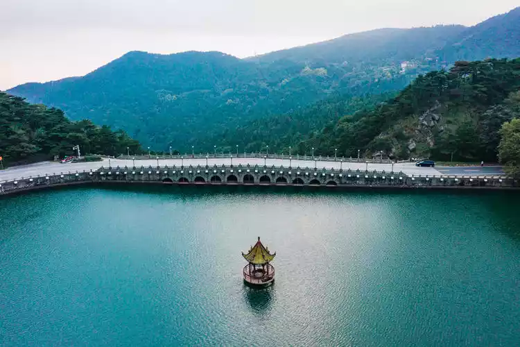Lulin Lake is surrounded by mountains, verdant pines and cypresses, creating a picturesque scene. Its waters are pristine and clear, mirror-like, reflecting the mountains. In the center of the lake stand two small pavilions, each beautiful and exquisite in appearance.