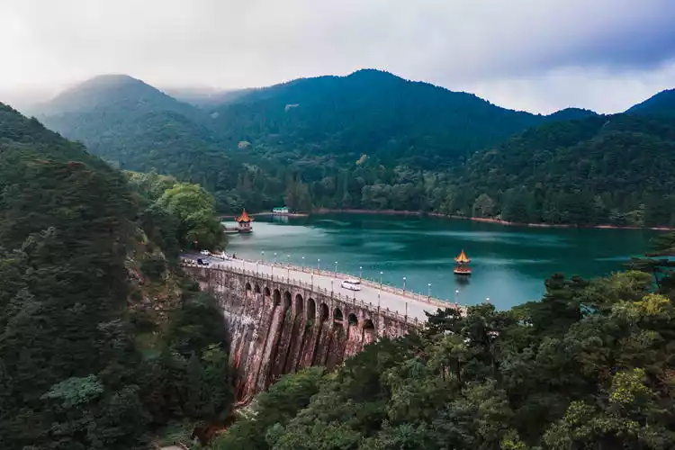 The Lulin Bridge is 30 meters high, integrating the bridge and dam, blocking the water to form a lake. The lake is like a mirror, like a glowing jade inlaid in the beautiful valley under the shade of trees, and is beautiful against the backdrop of misty clouds.
