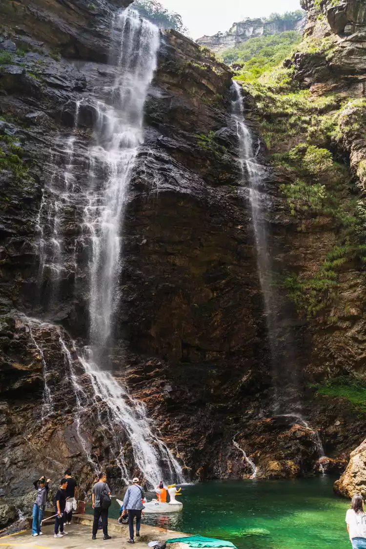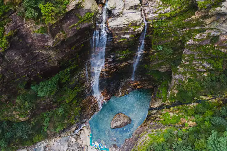 The three-fold waterfall converges into a clear pool on the mountainside, like a jewel hanging on a necklace. The water in the pool is so clear that you can see the bottom, and it is suitable for boating and also brings good luck.