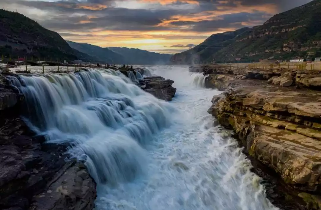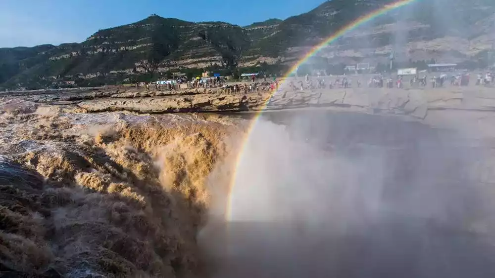 The flow is rapid, the surging Yellow River water carries mud and sand, the waves roar and the momentum is like a rainbow, presenting a "golden" landscape, forming the unique autumn flood beauty of Hukou Waterfall.