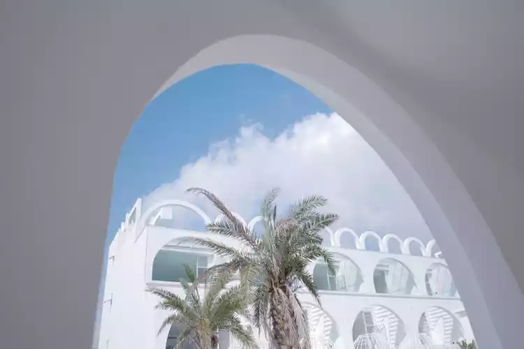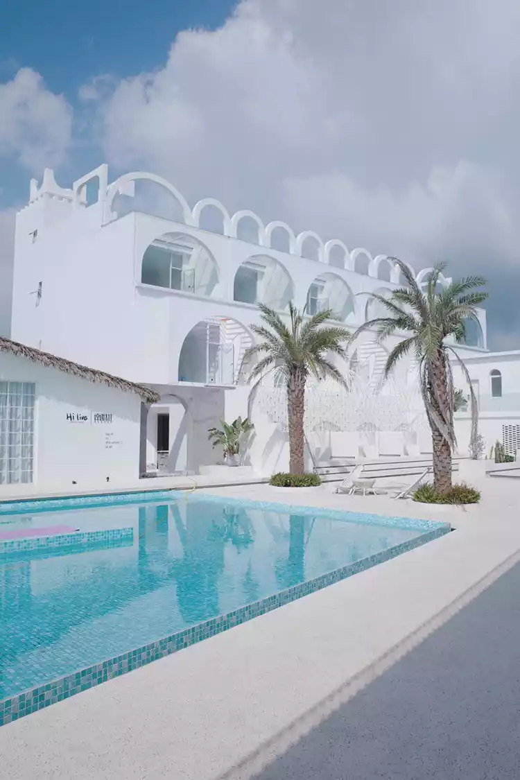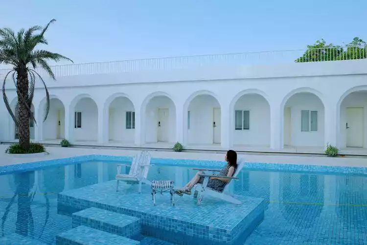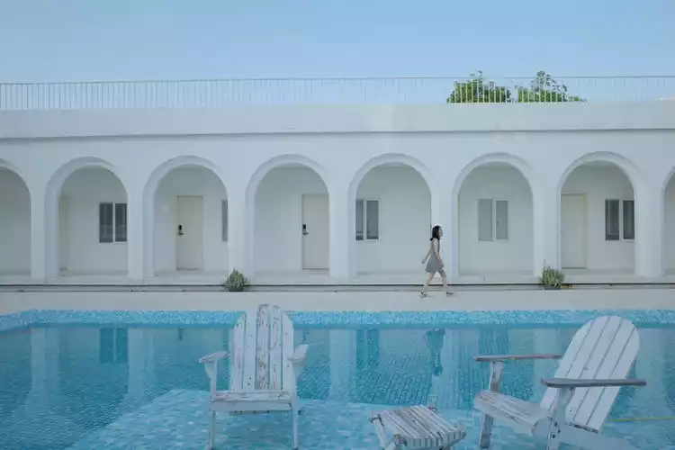 Across from the village is the beach, with white buildings juxtaposed against the blue sky. Looking at the entire property alone, it feels like you've arrived in Santorini. There's a blue swimming pool in the courtyard, making any photo you take a great one.