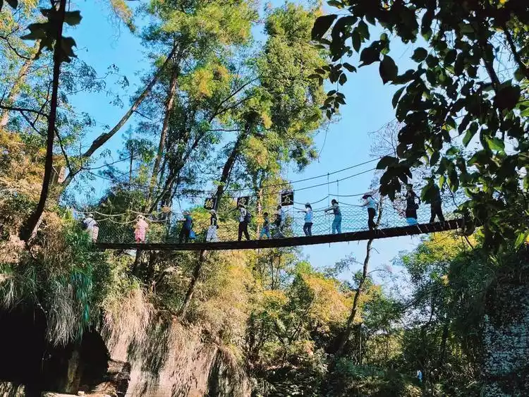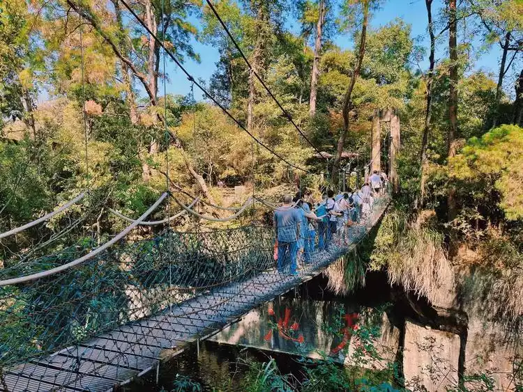 Above the fish shoals of Tianchi Lake is the Baisui Bridge. This bridge, constructed of planks and chains, sways from side to side. It's said that walking across it can grant you a hundred years of life. Haha, I walked on it, and it was quite thrilling. Staff at the bridgehead control the flow of people, limiting the number of people on the bridge to no more than 20 at a time.