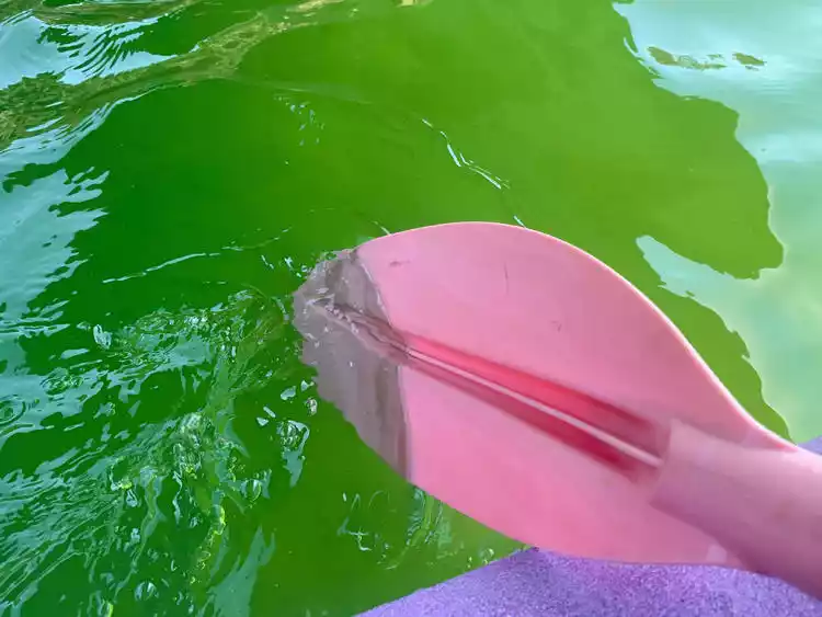 The water was clear and turquoise, and I reached in and gently stirred the water, feeling cool and comfortable. We paddled to the shade under the bridge and rested for a while. The cool breeze blew across the lake, which was so comfortable that I almost fell asleep.