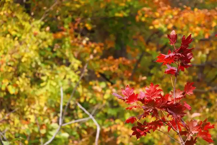Maple leaves are within reach along both sides of the mountain road. In addition to being deep and penetrating, the maple leaves here also have an elegant beauty. Each maple tree has a different red color, with distinct layers of red.