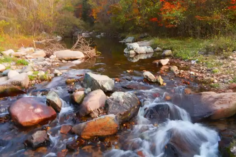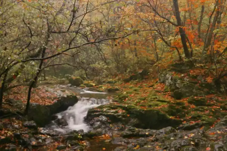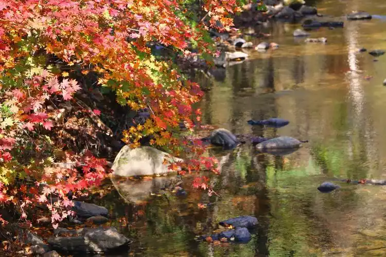 The maple trees scattered along the bank complement the splashes of water, creating a beautiful scene. There are many strange rocks of various shapes in the river, covered with mottled moss, staggered in the river, standing still to be washed, playing a melody of hardness and softness.