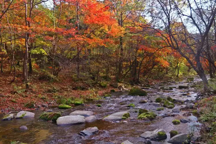 Along the Honkan Line are not only rolling hills but also countless rivers and streams, complementing each other: where there are mountains, there are maple leaves, and where there are maple leaves, there are trickling streams. There are numerous local farmhouses, offering home-style meals and accommodations. If time permits, you can stay overnight. Most of these have rural kangs, which are full of local flavor. To attract tourists, farmhouses are often built along streams or rivers. Another benefit of staying here is that you can enjoy the autumn scenery along the stream from your home, and at night, you can sit on the bank and look at the starry sky.