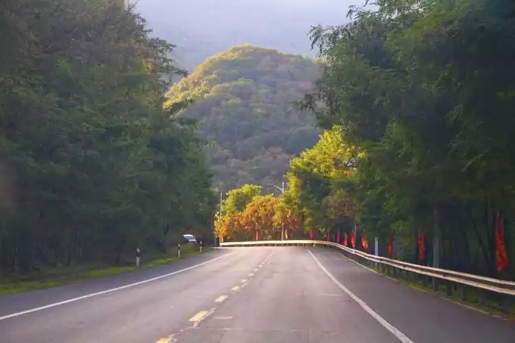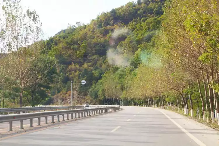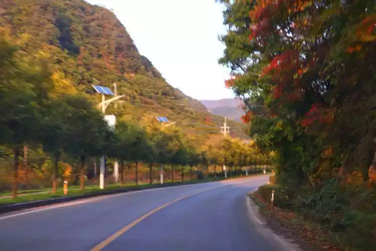 The feeling of the trees and mountains through the car window is truly breathtaking. The passion of autumn roars towards you, revealing its fiery and wild vitality. The ginkgo leaves on both sides of the road have turned yellow, telling a story of autumn.