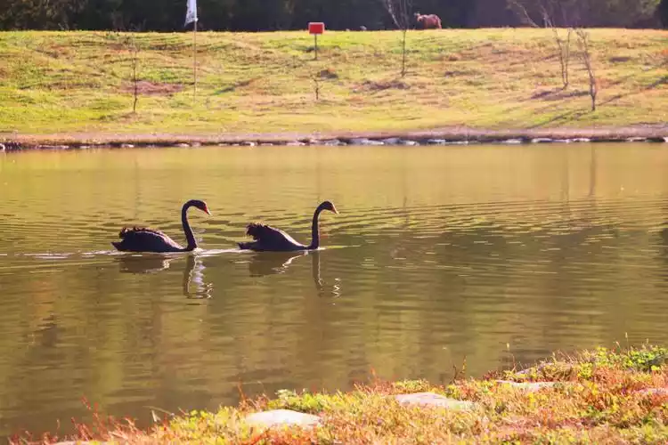 The small pond shimmered in the sunlight. Black swans sometimes swam ashore to bask in the sun, and sometimes swam into the water to find food and play. They also enjoyed the gorgeous autumn colors.