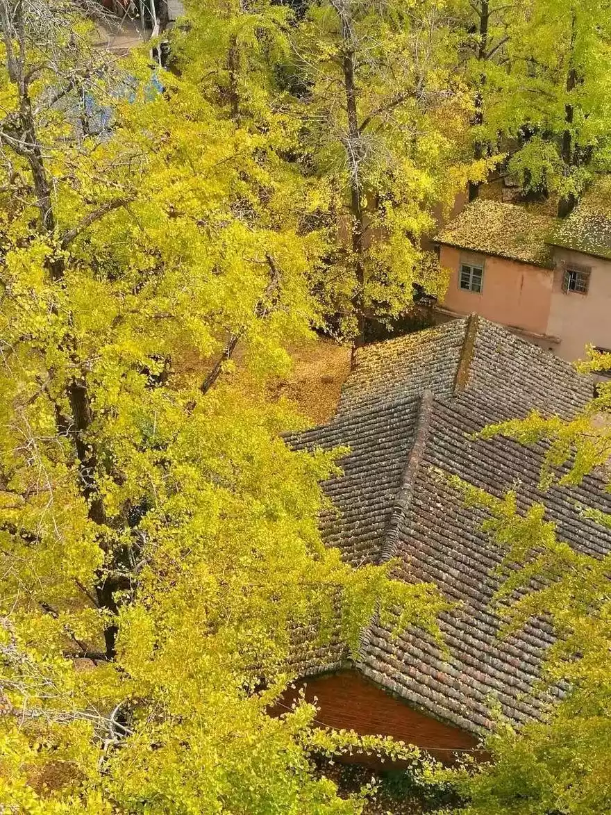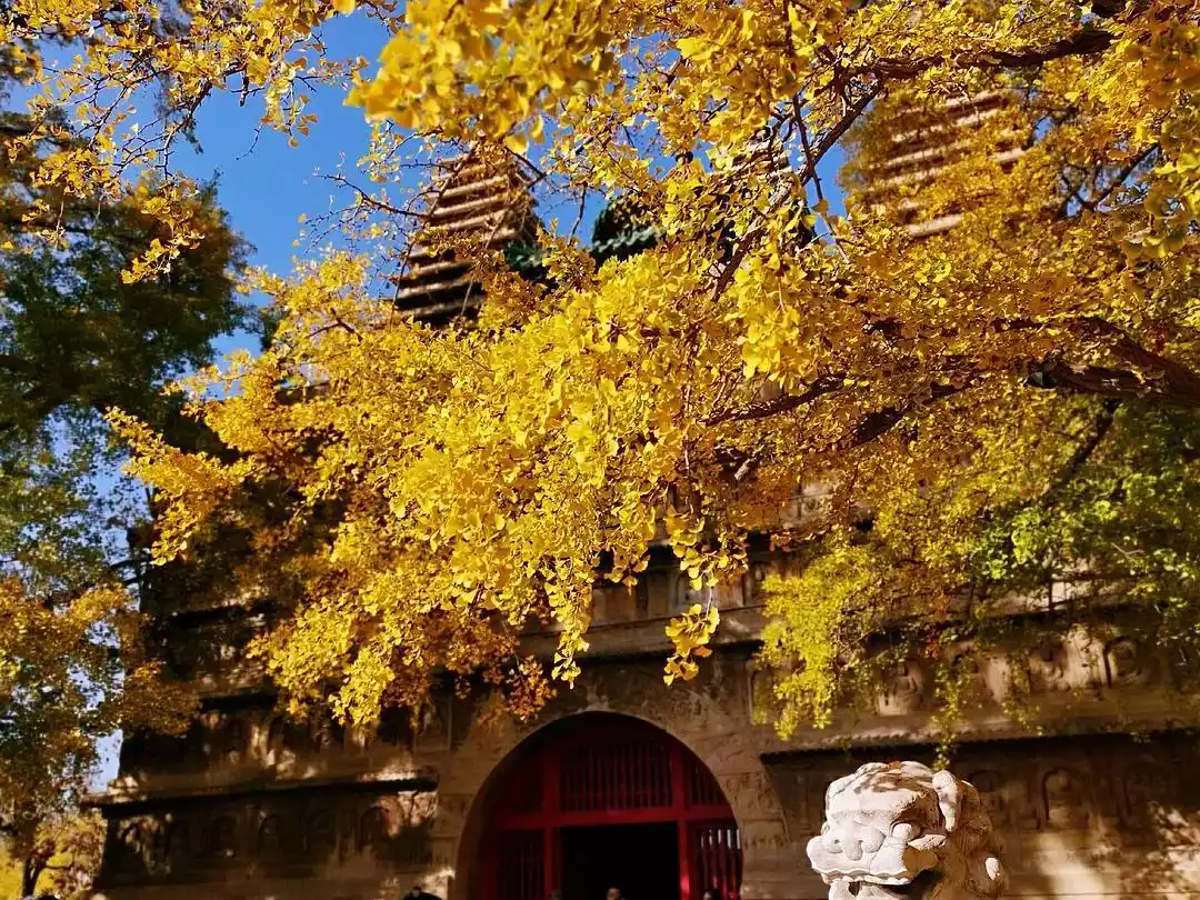 The ginkgo trees in the temple have a scent of incense. The sacred Buddhist tree Bodhi tree has difficulty surviving the winter in the north, so ancient monks used ginkgo trees instead of Bodhi trees. The ginkgo trees in the temple are full of autumn colors.