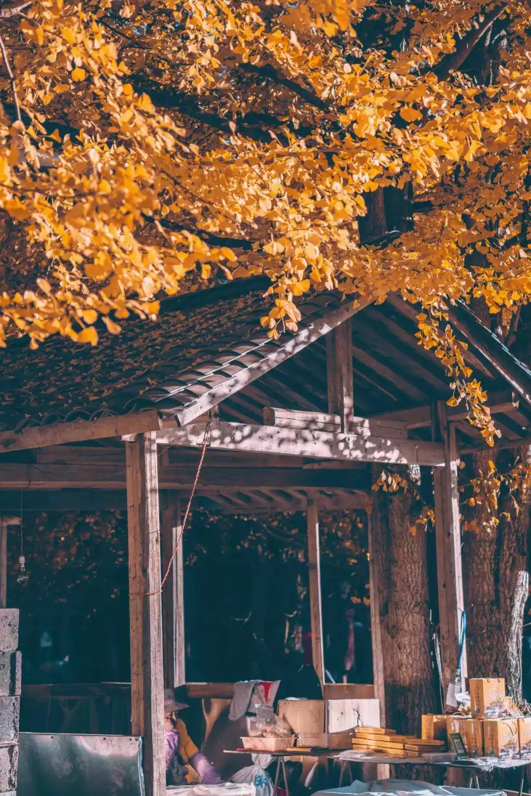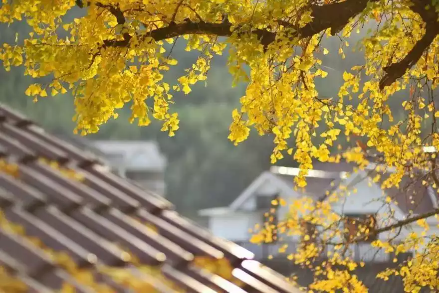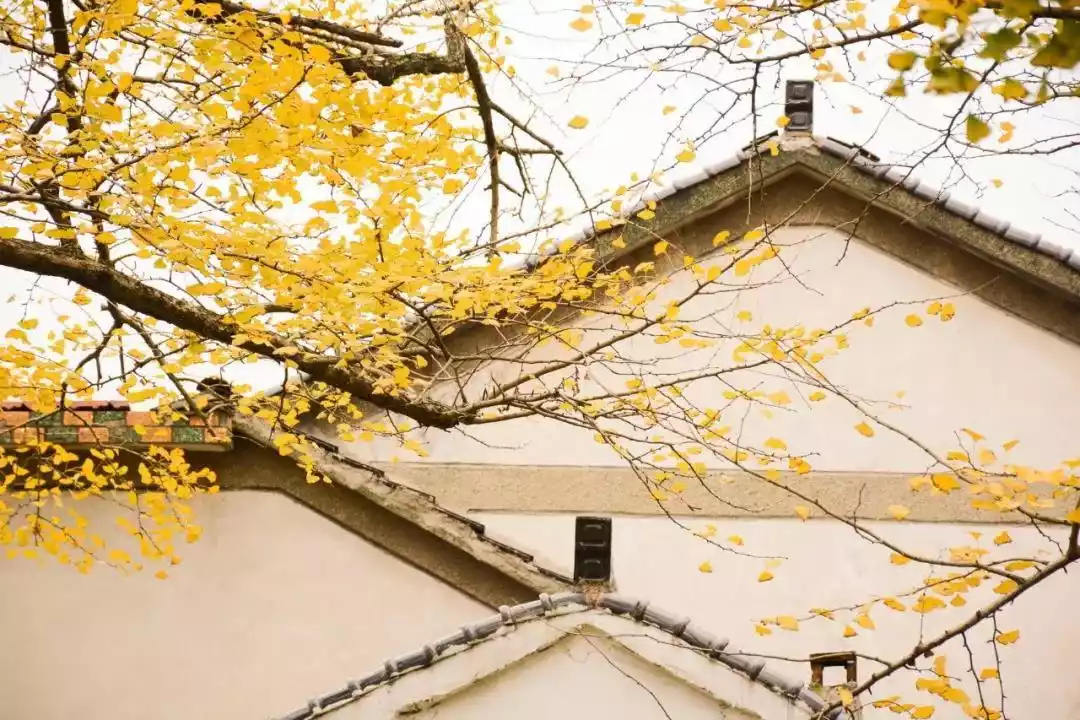Fallen leaves covered the stone paths and black-tiled houses. Even the clear stream and stone bridge in the village were decorated with gold by the fan-shaped ginkgo leaves.
