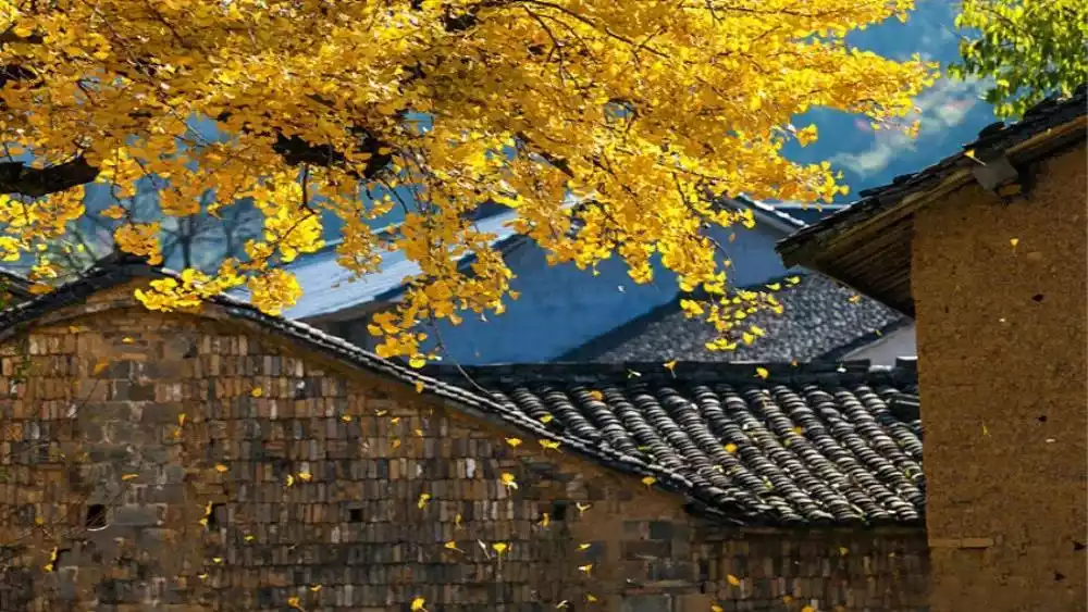 In autumn, the branches of the ginkgo trees stretch out in all directions from the paths, ridges, under the house foundations, and on the stone steps, supporting the entire Tuole Village on the roots of the trees. The layers of green leaves in summer have all turned golden yellow.