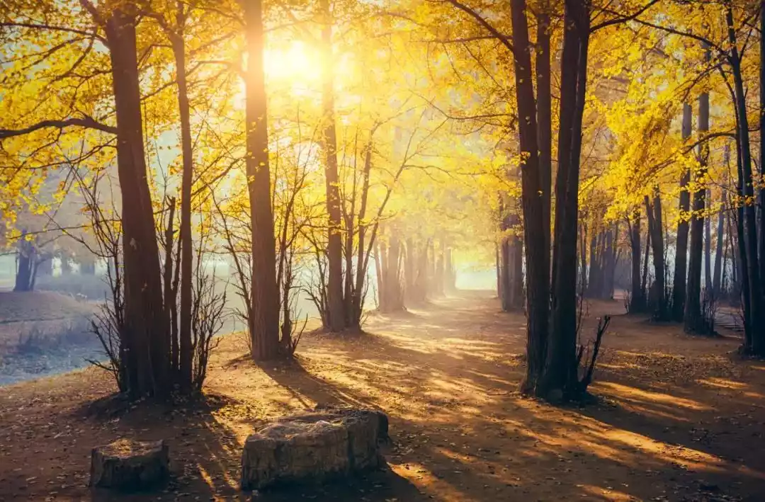 The sunlight shines through the golden leaves, illuminating the village's mist and smoke, as if time has slowed down.