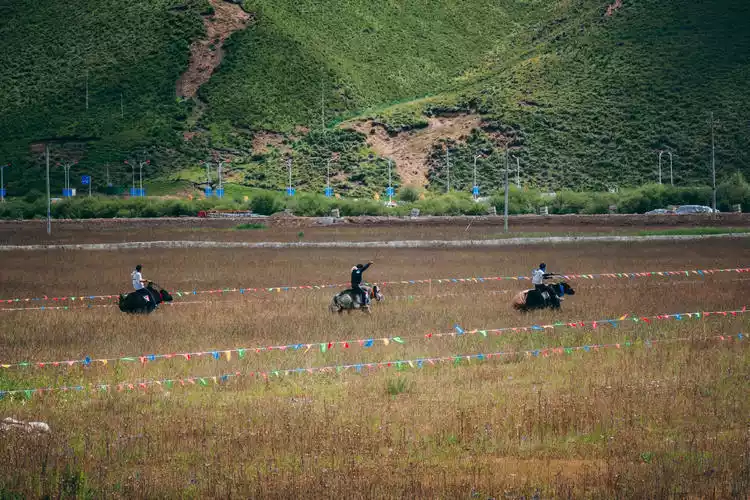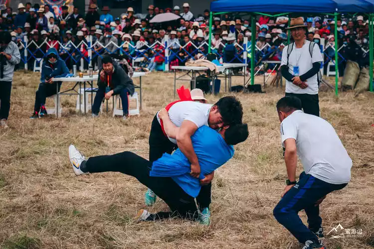 The competition involves lifting leather bags, each weighing over 200 pounds. Competitors must lift the bags onto their shoulders to pass. Tibetan wrestling is incredibly thrilling, with both players grasping each other's belts and pressing down on them. Weight isn't crucial here; it requires not only a stable lower body but also strong upper limbs. There's even a yak race here—how impressive!